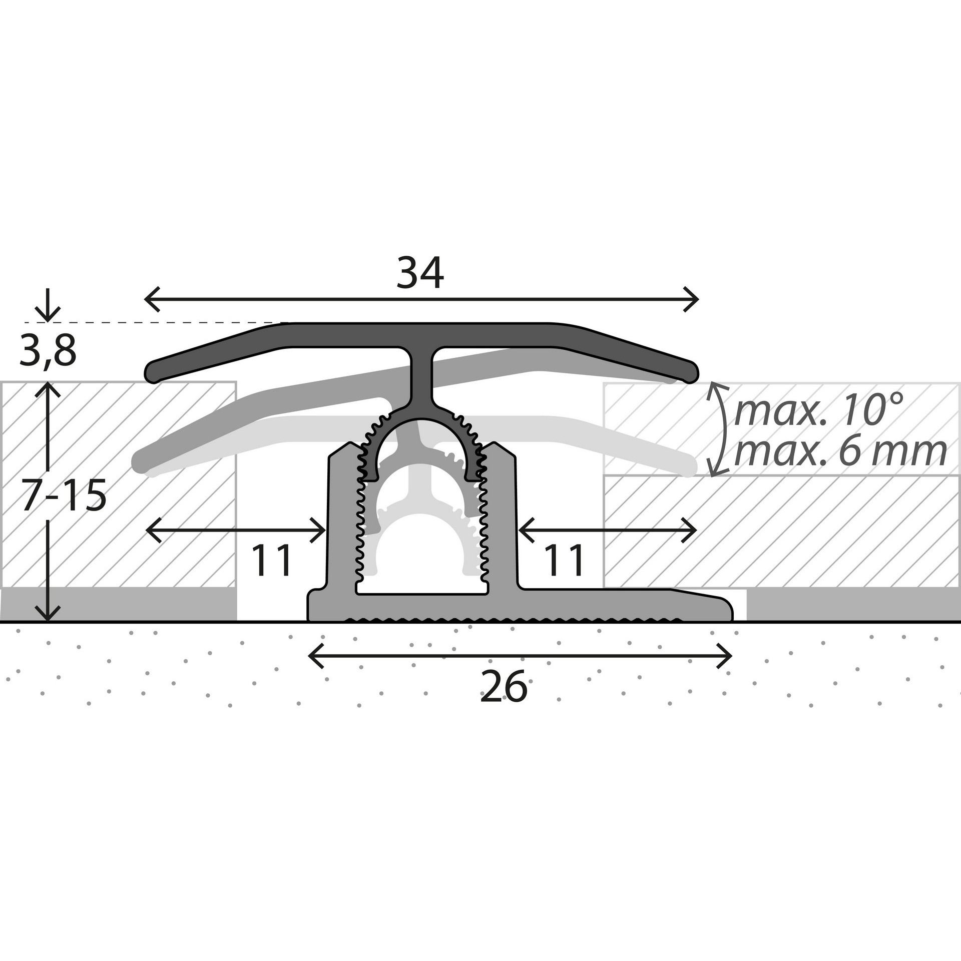 Suitable for joining laminate and parquet flooring of the same height. The upper profile with the toothed connector locks into the base profile, adapting automatically to the flooring.