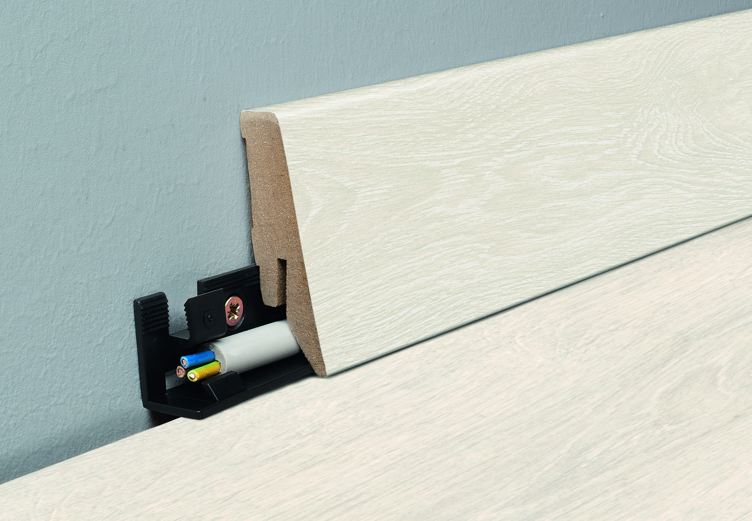 This modern 18 mm deep MDF skirting board in straight shape perfectly covers the expansion joint of the floor. It can be secured with the montage clips provided. Laying cables behind the skirting is possible.