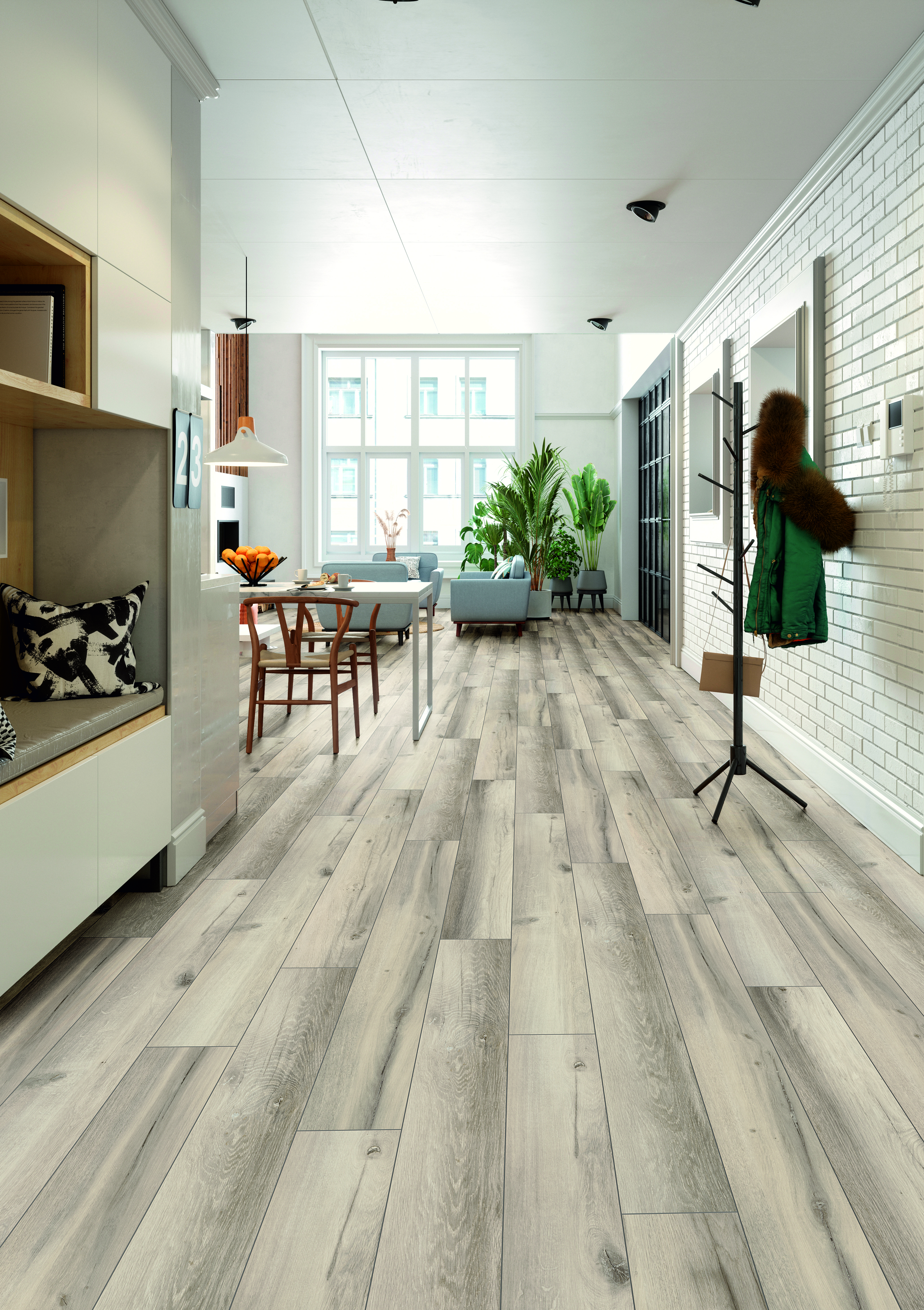 The Organic Flex Orca laminate floor fits perfectly into a modern interior or minimalist style. This floor conveys a feeling of cleanliness and also gives the room a feeling of spaciousness. The PerfectPad® cork layer provides more comfort and excellent acoustic properties, making it ideal for high-traffic areas. The innovative moisture-resistant technology guarantees the floor a long life, even in humid conditions. The 1clic 2go pure+ click system enables effortless installation. How does O.R.C.A. technology work? The Orca carrier plate is achieved by a special organic binder that encloses each fiber and thus prevents water absorption. This technology offers up to 100 hours of splash protection, making it ideal for kitchens and other wet areas. Each wood fiber is enclosed by a specially developed organic-chemical binder and encapsulates it against moisture. The products are heat and UV resistant and are therefore perfect for sunny rooms. At Organic, organic ingredients are made resistant to liquids using a special technology.