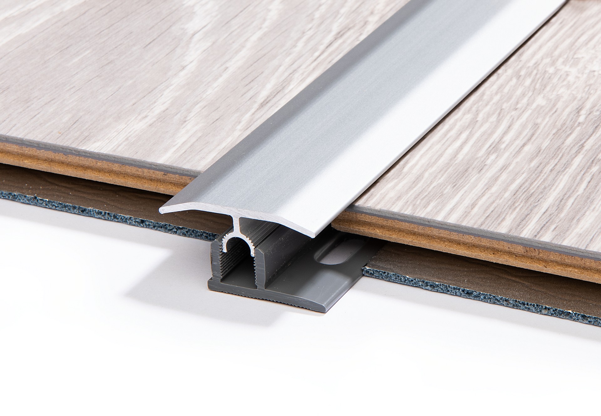 Suitable for joining laminate and parquet flooring of the same height. The upper profile with the toothed connector locks into the base profile, adapting automatically to the flooring.